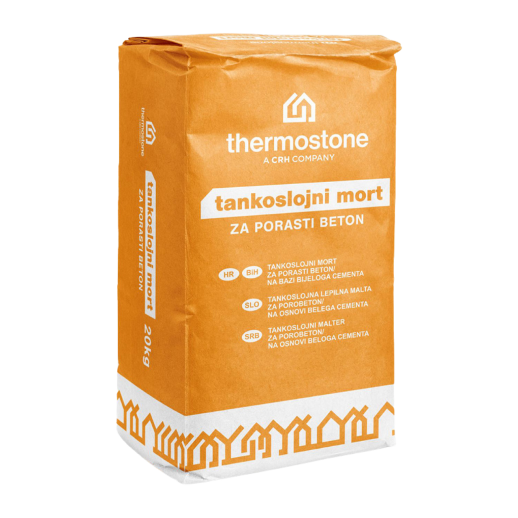 THERMOSTONE tankoslojni mort za porasti beton predviđen je za polaganje blokova od porastog betona prilikom izgradnje jednoslojnih vanjskih i pregradnih zidova. Specifična receptura i nanošenje tankoslojnog morta posebnim alatima omogućavaju postavljanje morta u debljini od 1 do 3 mm.